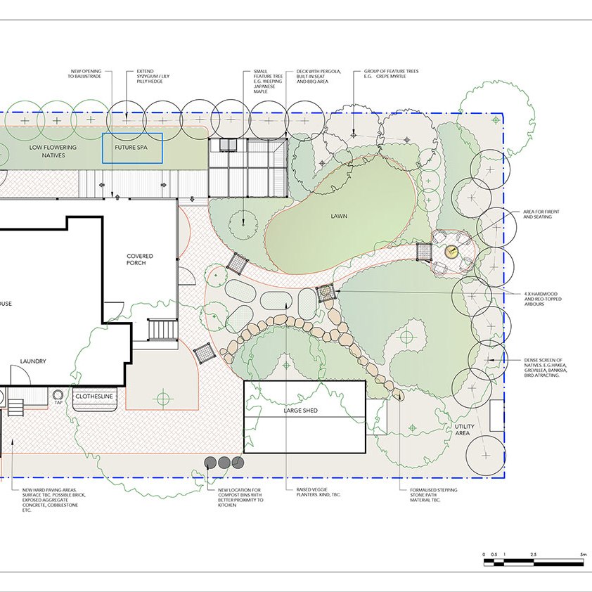 First step was to engage one of my trusted arborists to assess tree health and safety, remove weedy or invasive species and give everything a good prune to renew health and vigour. Next I created a design connecting a barbeque area with deck and pergola, as well as space for a spa, native plantings, raised veggie garden and areas of formalised paving. The garden will be built in 2025.