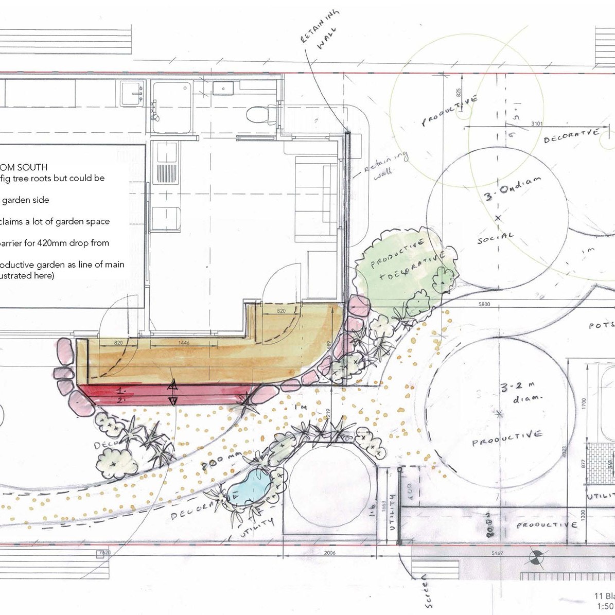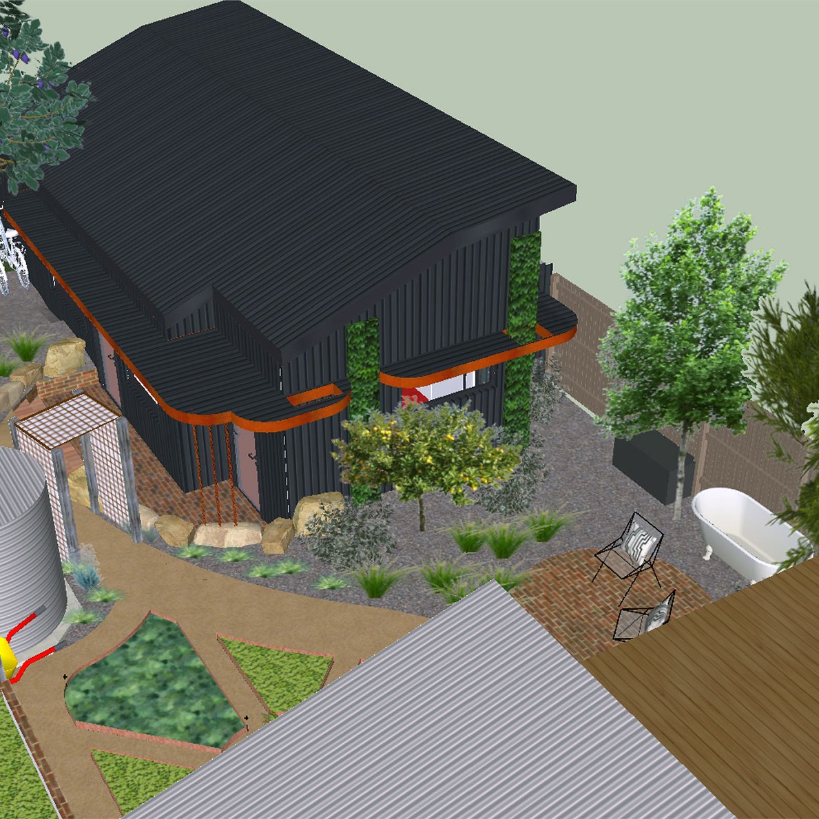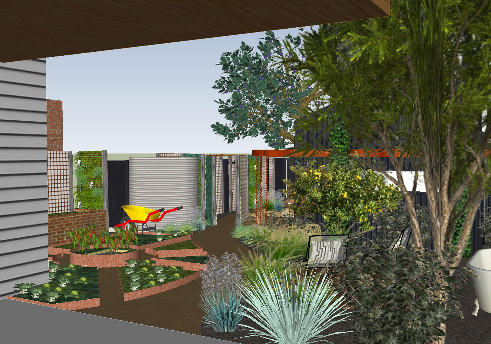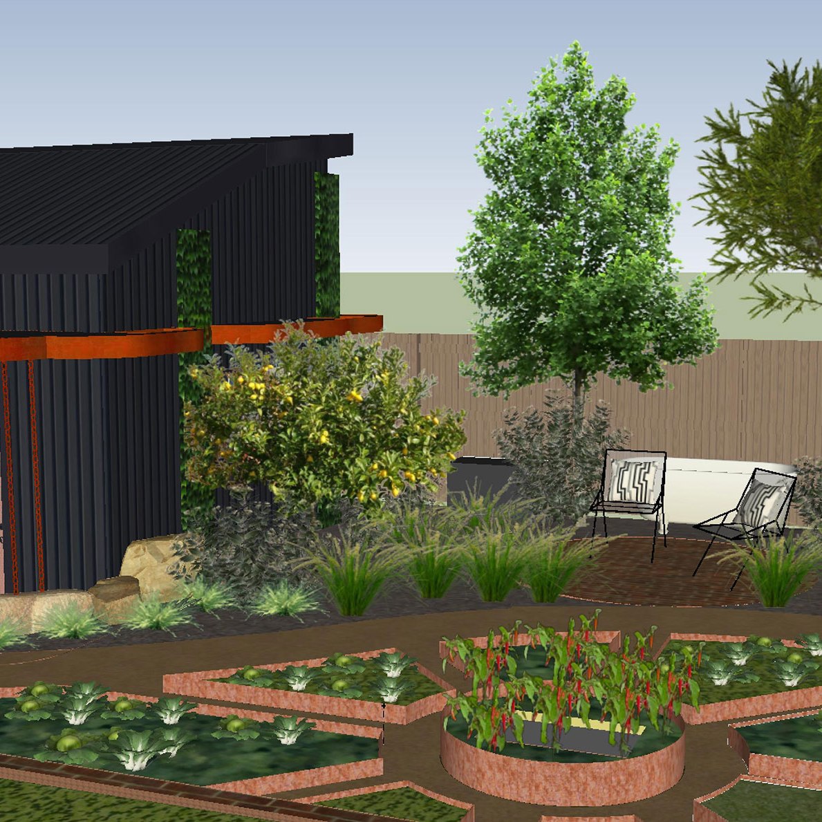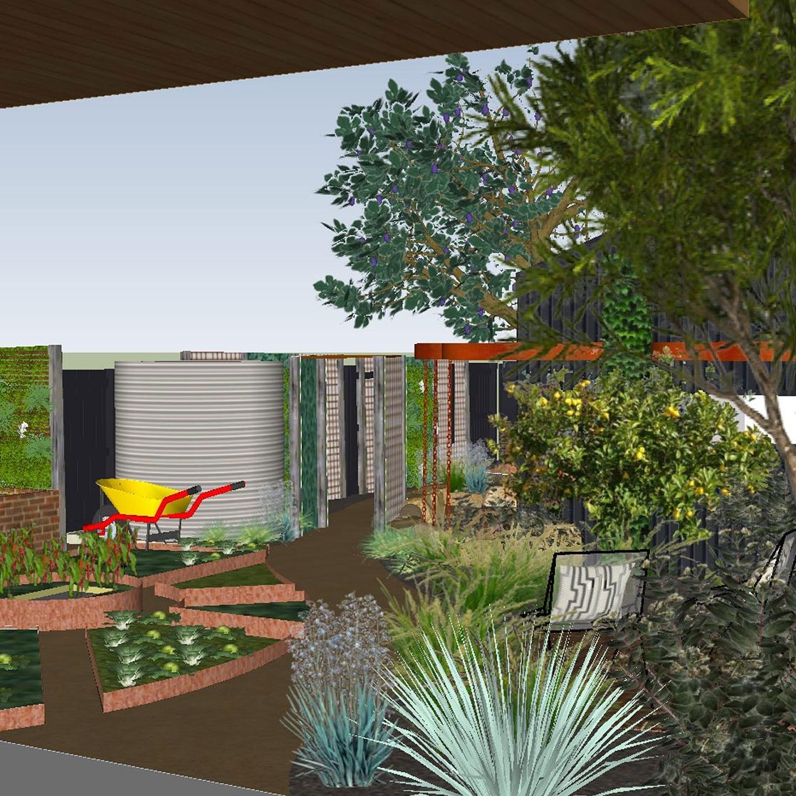An inner urban household who are building a new studio at the rear of their property. They wanted design solutions for a complementary garden that would maximise productive growing space and create zones for entertaining and a native garden.