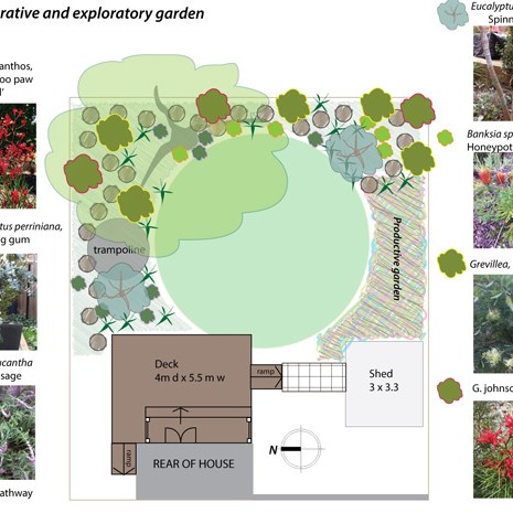The garden design included opening up the rear of the house with French doors, incorporating a deck to navigate a gentle slope and the creation of an indoor/outdoor living zone. The design includes play and exploration areas as well as space for decorative and productive plants.