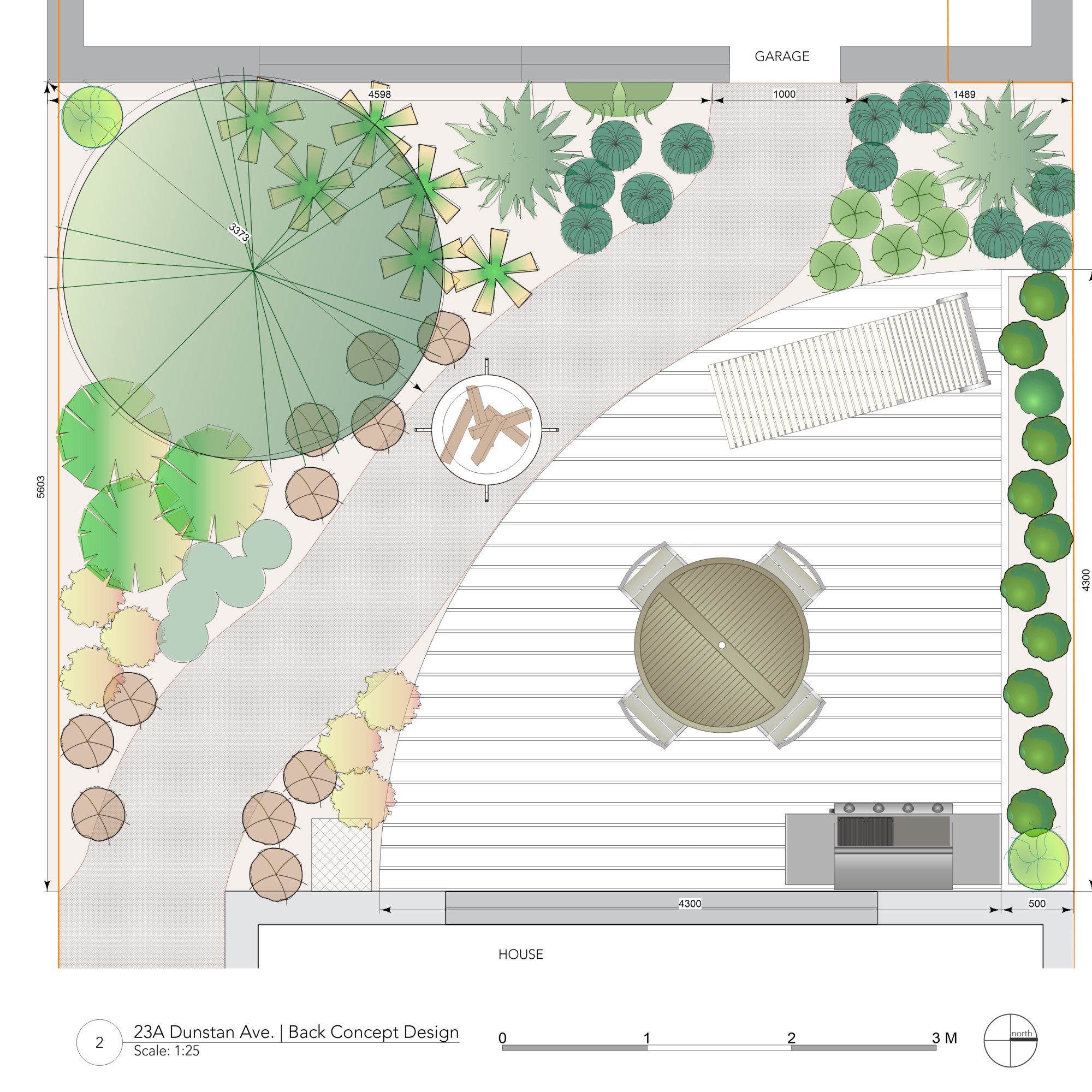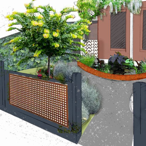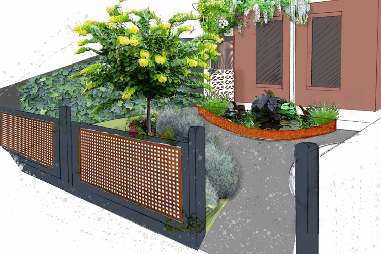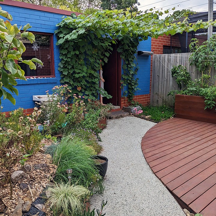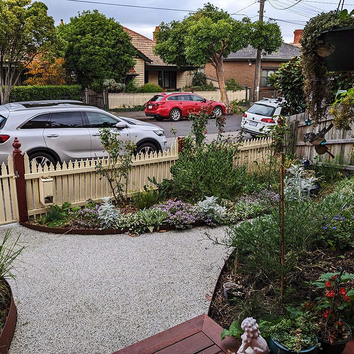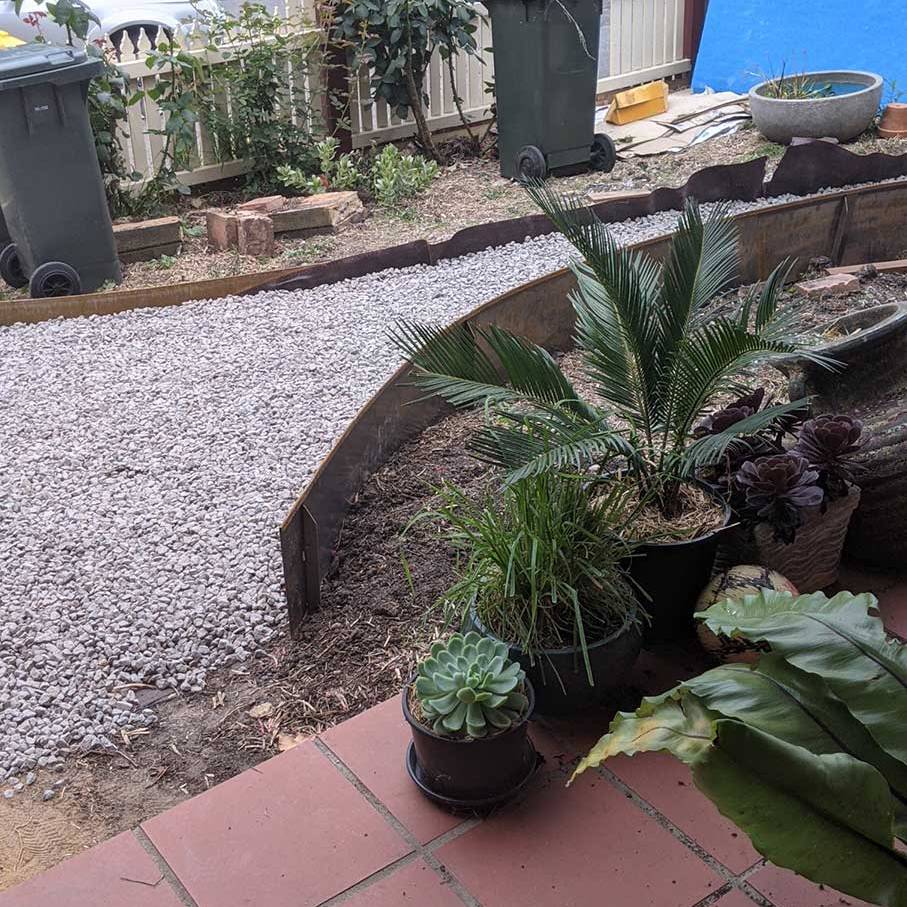 A curved deck and raised seating and garden bed form the main elements of the entertaining area. The clients report the small courtyard feeling more spacious. Permeable pebble paving and Corten edging enhance access to the rear garage and side of house. The front garden has better access to utilities like the bins. Curved Corten edging, a frog pond and a feature tree will enhance and update the entry to the house.