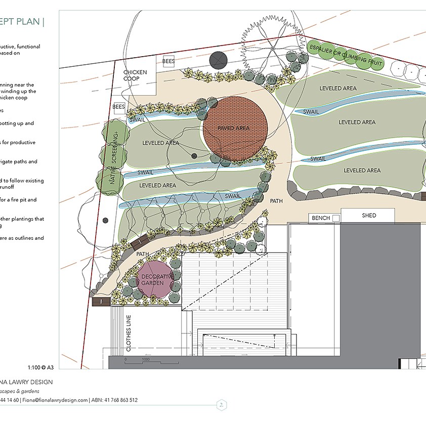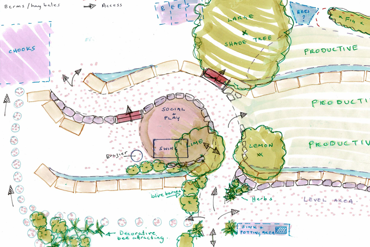 A large block in suburban Canberra on the slopes of Mount Painter. A resourceful and energetic client seeks to clarify design ideas for a productive permaculture garden with chooks and bees.